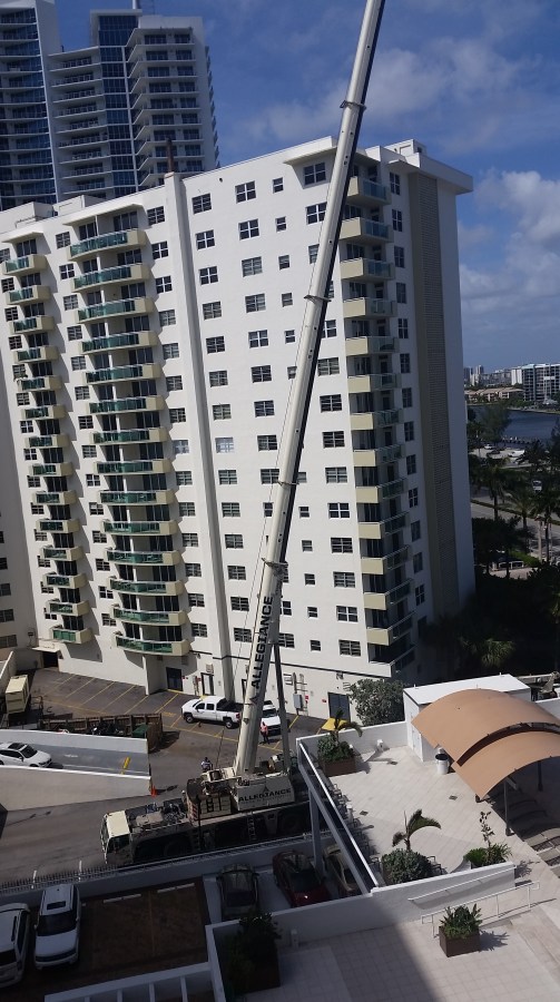 Hoisting New Central Air Cond. Components to the top of Aquarius June 20, 2016