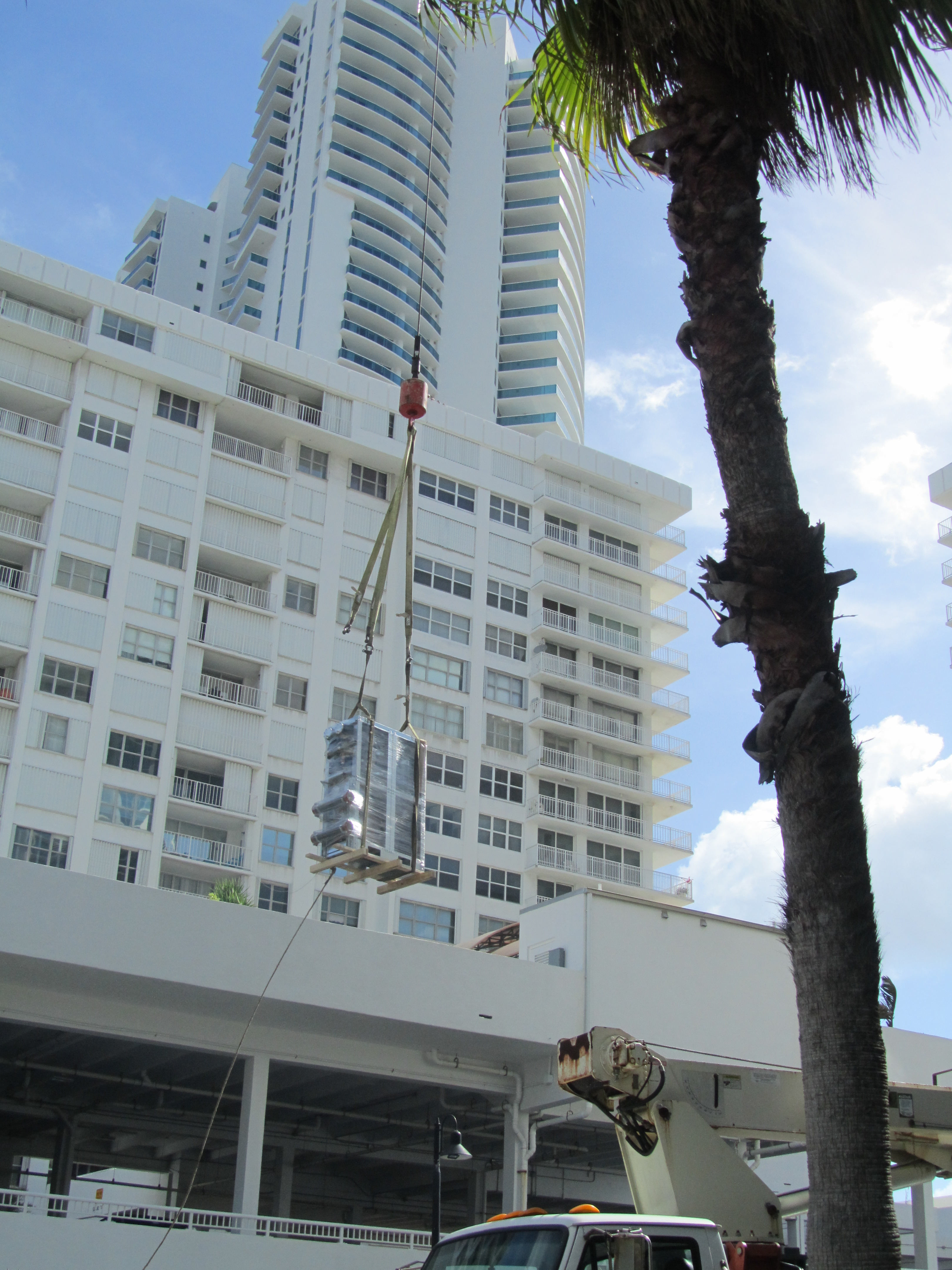 Hoisting New Central Air Cond. Components to the top of Aquarius June 20, 2016