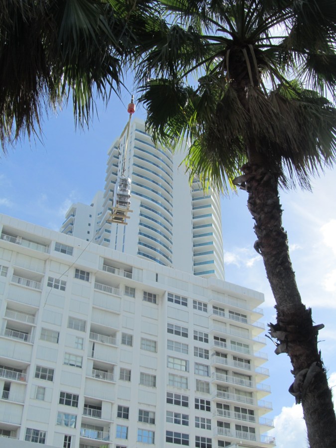 Hoisting New Central Air Cond. Components to the top of Aquarius June 20, 2016