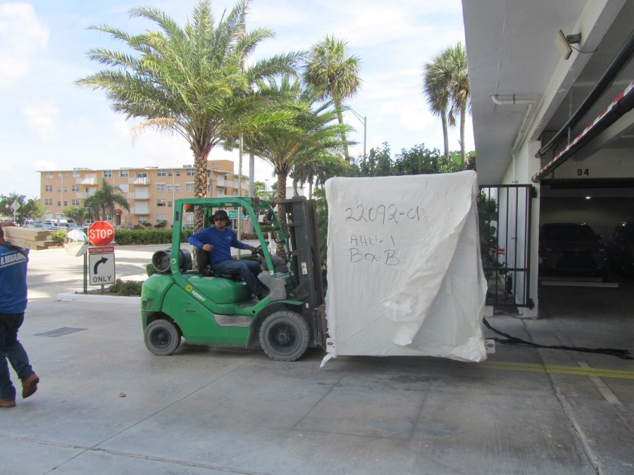 Hoisting New Central Air Cond. Components to the top of Aquarius June 20, 2016