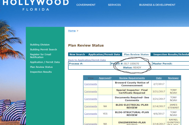 It is fair to praise the work of the teams of Hillman Engineering and Structural Restoration our Technical Engineer of Record and our General Contractor for getting the permit. As you can see since early February the several areas of inspection of the City of Hollywood have been assisted by these two firms to give us the needed approvals in an expeditious maner.