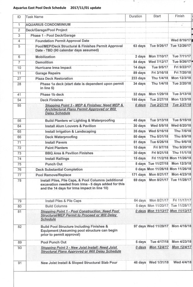 Aquarius East Pool Deck Construction Schedule Rev.: 2017/11/01