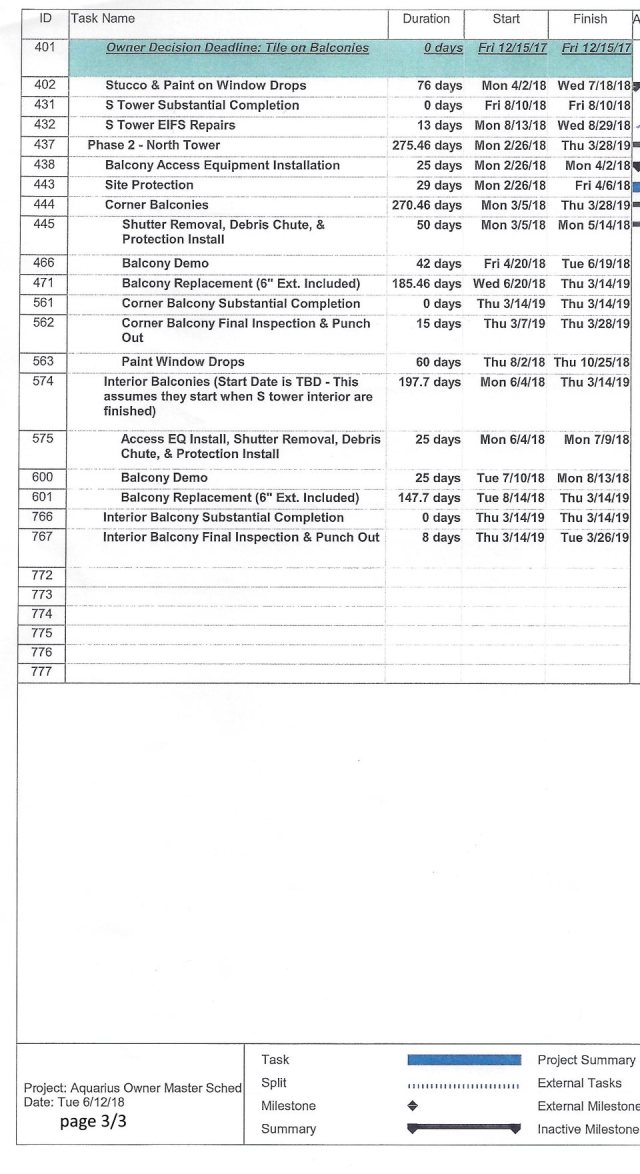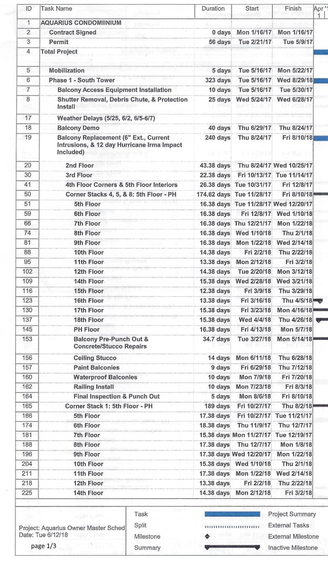 Master Schedule of Aquarius Towers and Balconies 40 ReCertification Exercise update 6/12/2018