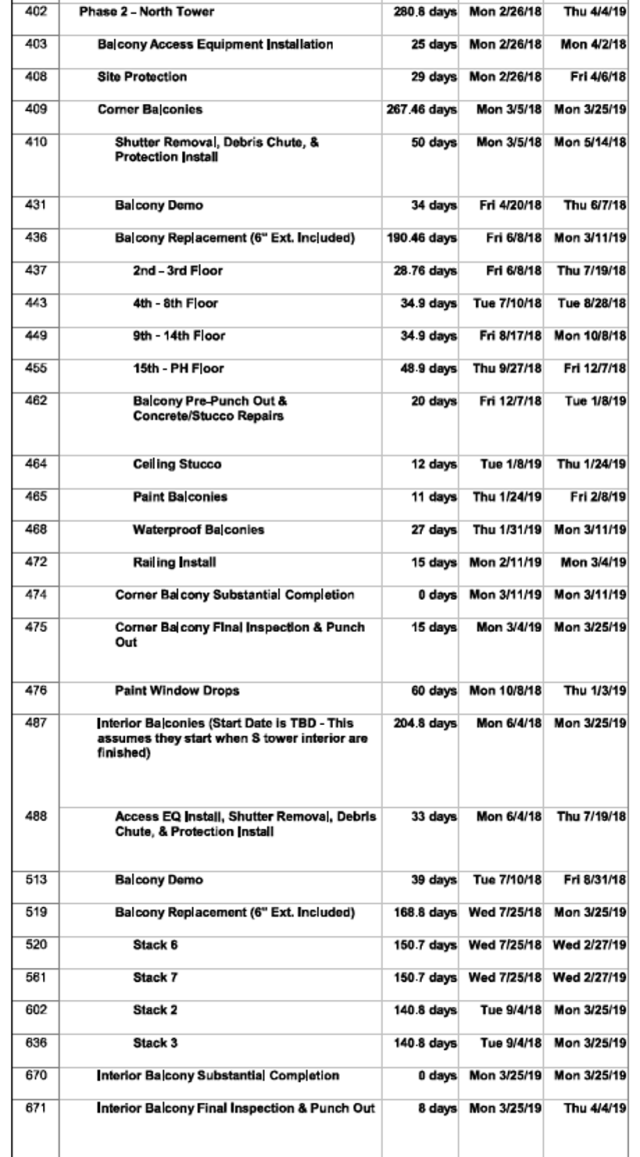 At Aquarius it is not different. Everybody is anxious to have their balconies back, the pools open and the silence, peace and absence of dust. This post has the latest schedule presented by the construction firm in charge of the Aquarius 40 Year Recertification project: Structural Preservation Systems. This schedule was not formally vetted by the Technical Responsible and General Project Manager Hillman Engineering. Of course it is not finally accepted by the Aquarius Condominium Association.