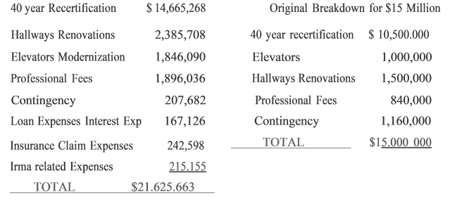 As you can see, we far exceeded our projected costs in each of our original estimates based, not only on bids received, but also changes to our original scope of work. There is no mystery as to how the total project costs exceeded the original estimates. It is based upon the discovery of unforeseen conditions identified by our consultants and by us. The total expenditures identified above were funded by the following resources: