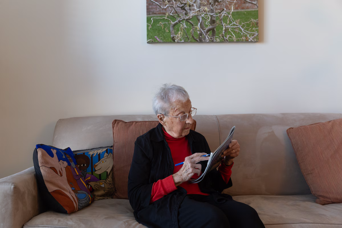 Jaffe works on a word puzzle. She remains engaged with other people and has subscriptions to the Metropolitan Opera, the New York Philharmonic and a chamber music series. (Jackie Molloy for KFF Health News)