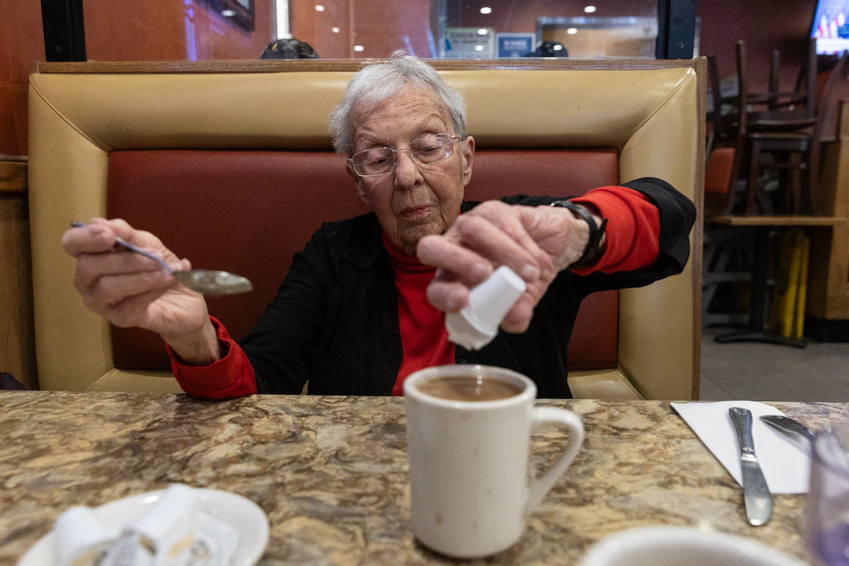 Jaffe has lunch at a diner in New York. She said she doesn’t worry about what comes next and she just lives day to day. (Jackie Molloy for KFF Health News)