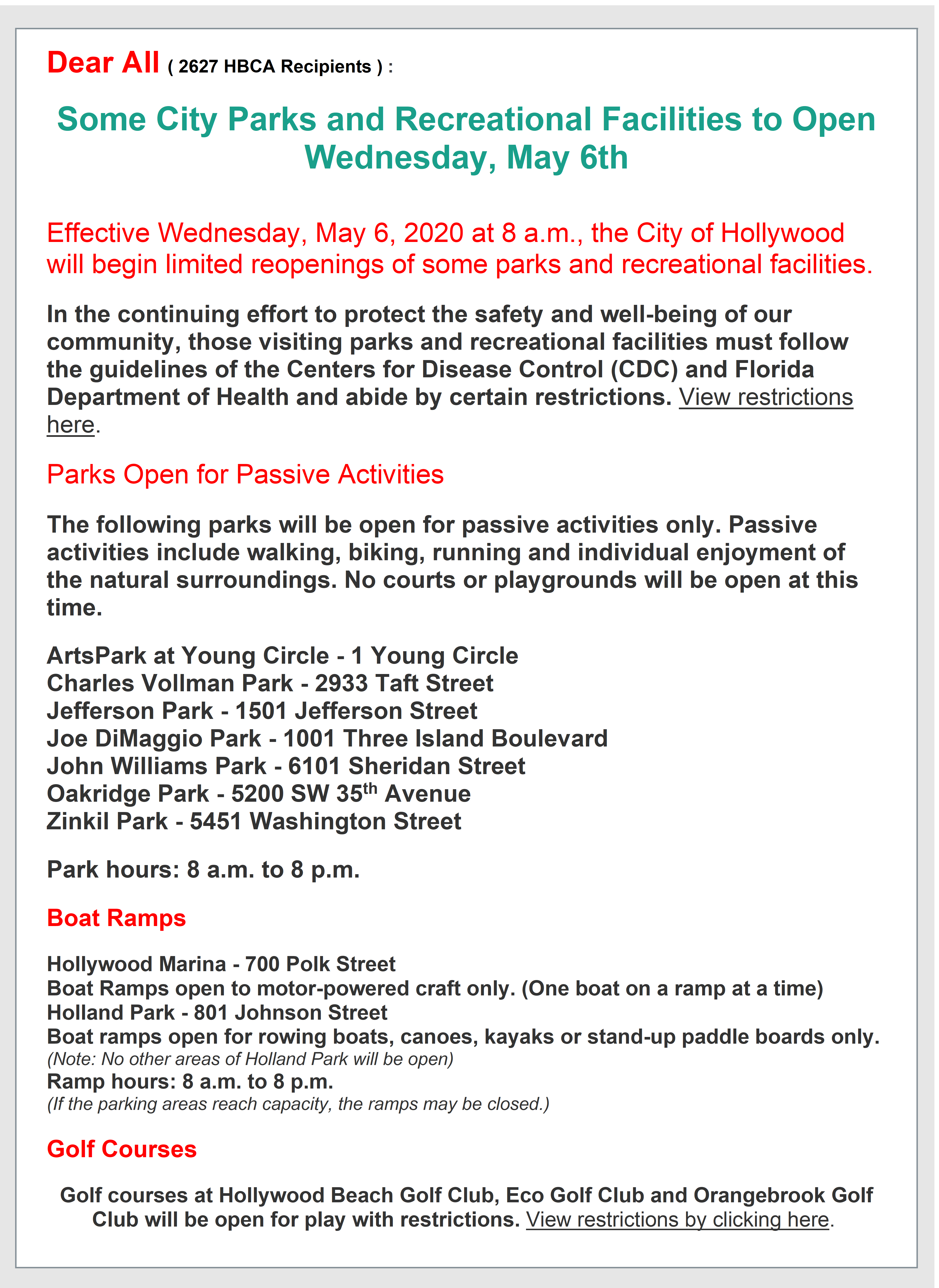 Hollywood Reopens some Parks May 6.