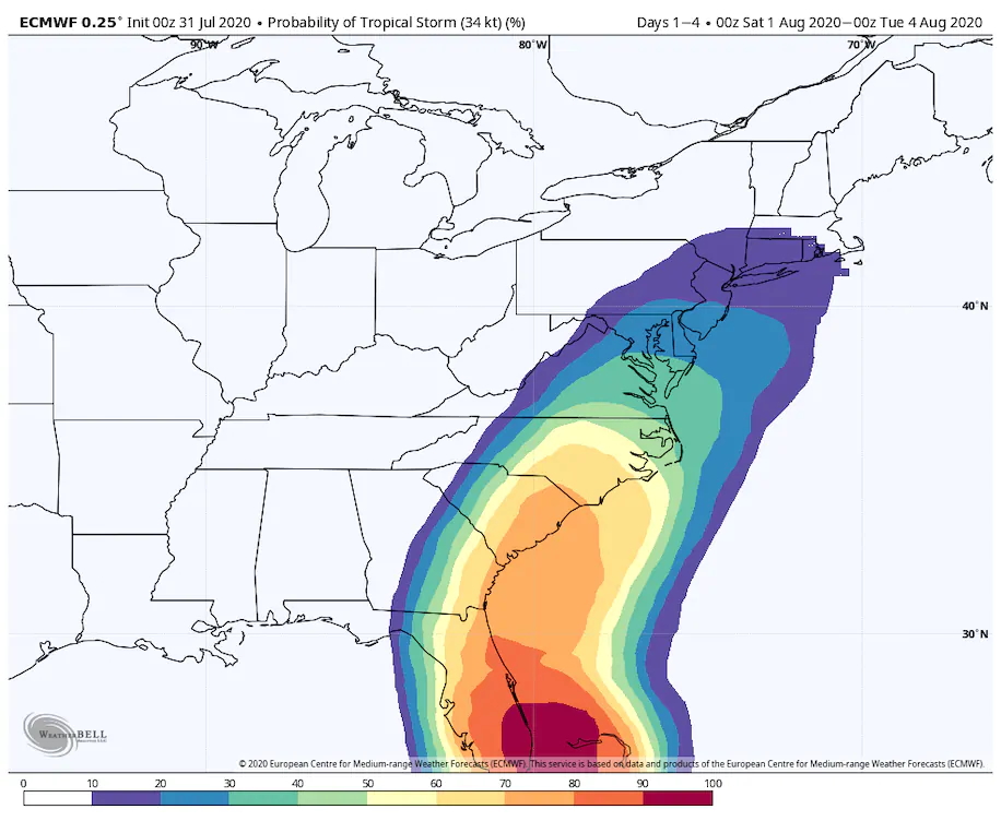The European model run on Friday morning simulates the probability of tropical storm force conditions associated with Isaias. (WeatherBell)