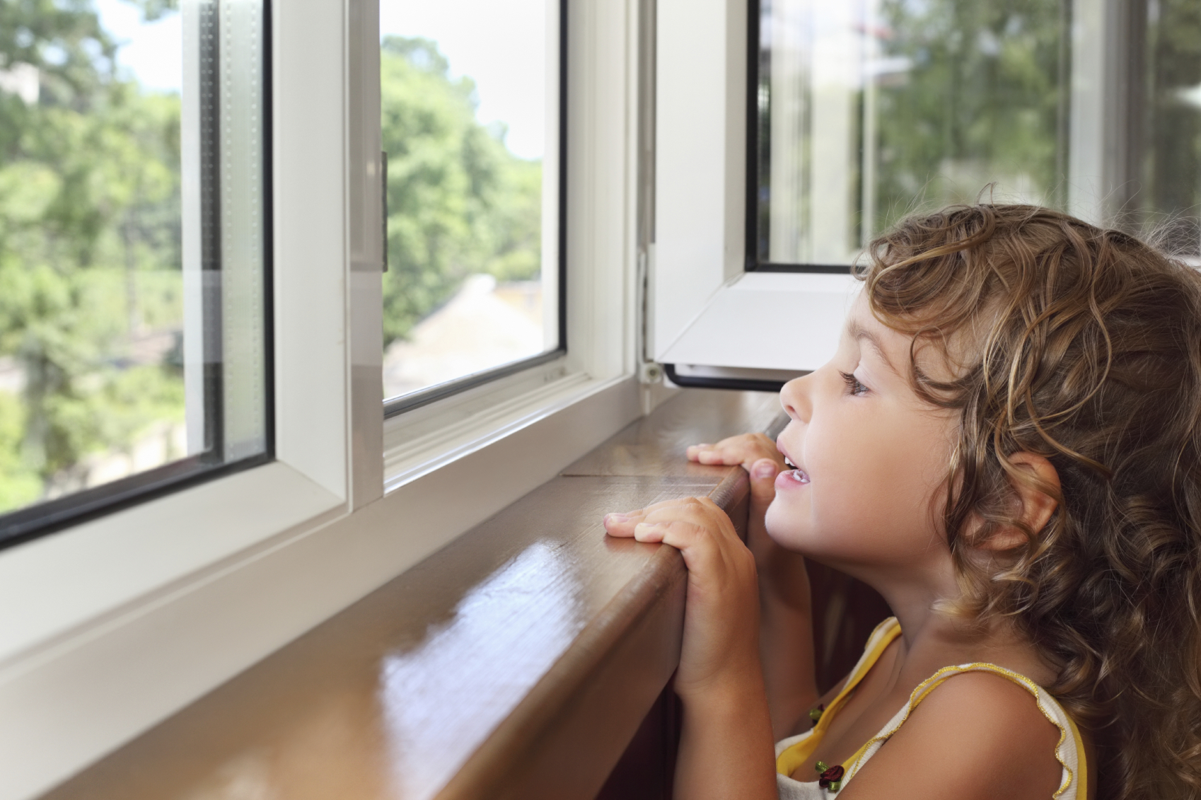 pretty smiling little girl on balcony, look from window